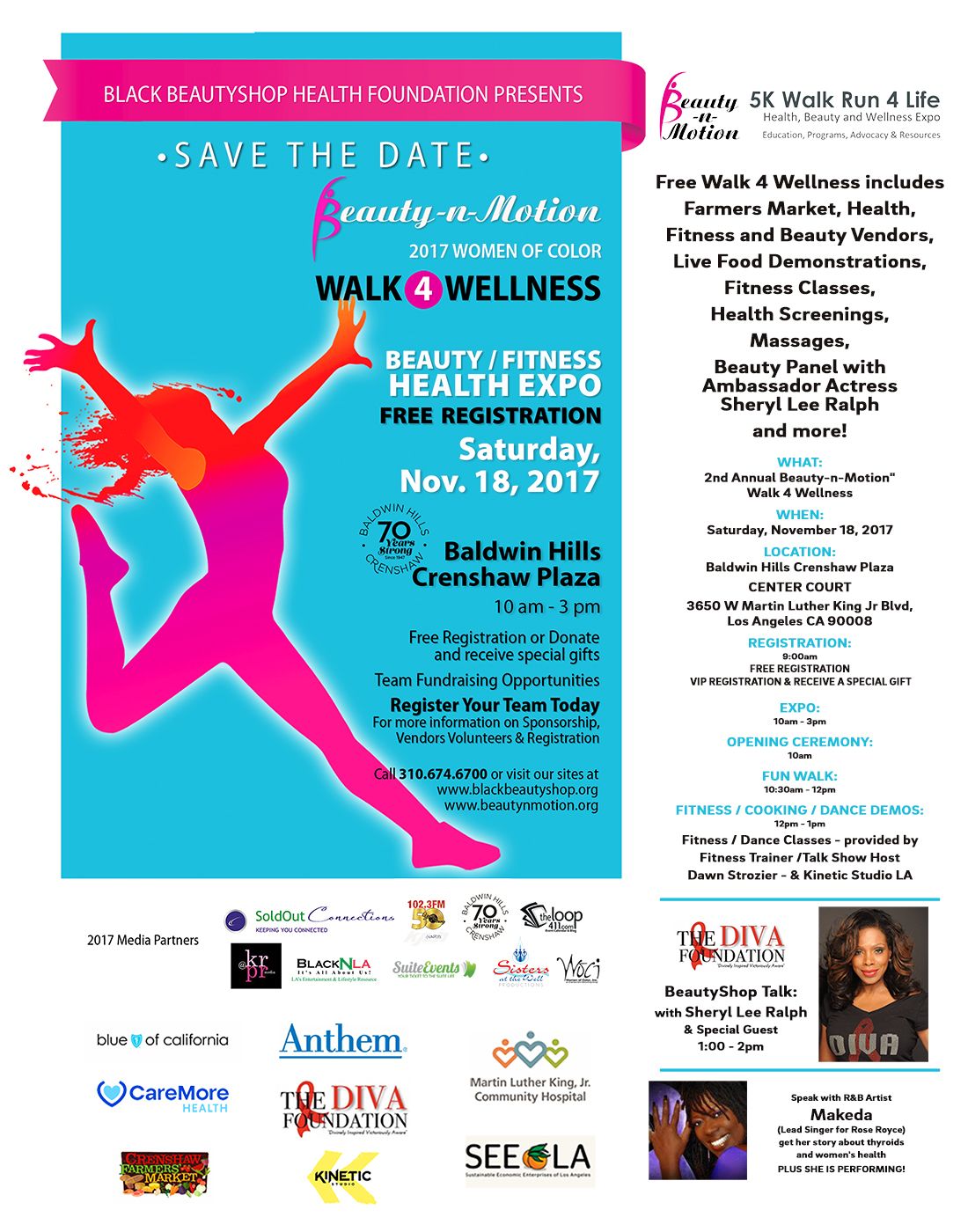 Beauty-n-Motion Walk 4 Wellness is the only National Walk/Run event focused on Women of Color overall health and wellness.  The Walk was also designed to encourage African American women organizations to work together and provide an opportunity to raise funds for their organization programs.